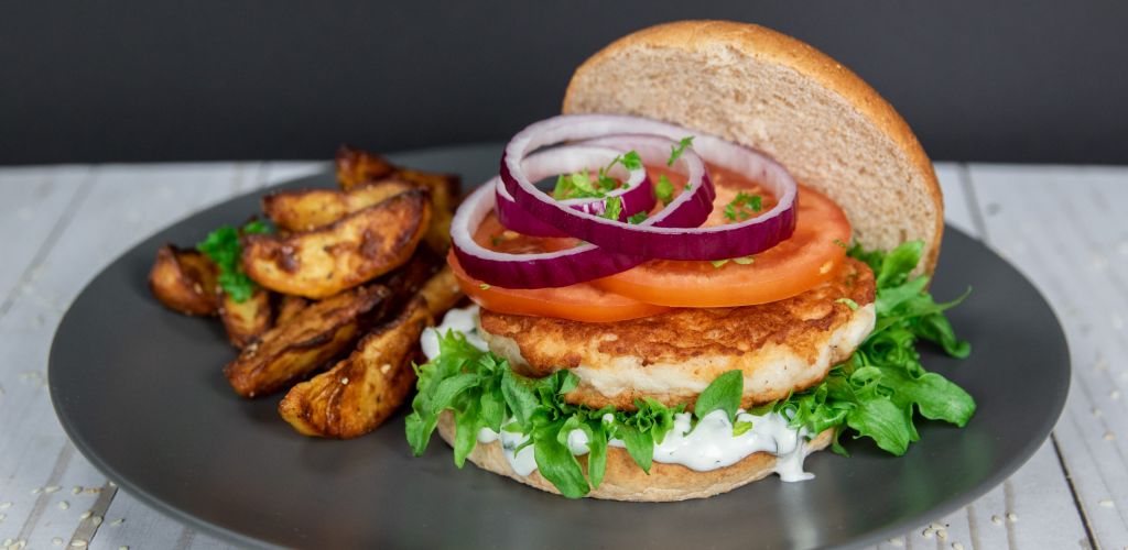 - Smør valgfri dressing på burgerbrødet, topp med salat, fiskeburger og resten av grønnsakene. Topp med burgerbrødet og server!